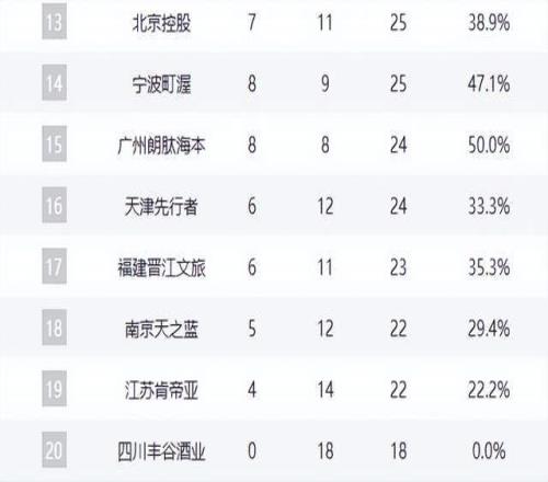 积分榜第13名是北控队,战绩与新疆队相同,为7胜11负。第14名属于宁波队,战绩为8胜9负。广州队以8胜8负的战绩排在第15名,在少赛两轮的情况下,排名较为吃亏。积分榜第16名至第20名则分别是天津队、福建队、同曦队、江苏队和四川队。江苏队本轮掀翻天津队,成功拿到赛季第4胜,而四川队则继续在积分榜垫底。