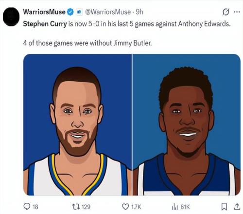 这场比赛后,库里最近五次面对爱德华兹都取得了胜利,而且这5场胜利中有4场都没有吉米-巴特勒,这说明库里成为爱德华兹的一个梦魇。