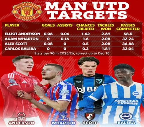 曼联的其他目标,还包括埃弗顿的詹姆斯·加纳、伯恩茅斯的泰勒·亚当斯、狼队的若昂·戈麦斯、桑德兰的诺亚·萨迪基和哈比布·迪亚拉、西汉姆联的马特乌斯·费尔南德斯等。