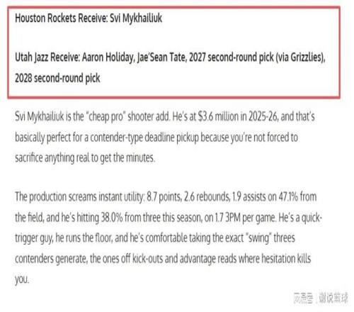 媒体FW结合各队需求,就策划火箭跟爵士进行交易,比如可以争取神射手米哈伊柳克。在这笔交易方案中,火箭送出两替补阿龙-霍乐迪跟杰肖恩-泰特,再加上次轮选秀签,分别来自2027和28年,主要就是赢在当下,提升现阶段投射稳定性。