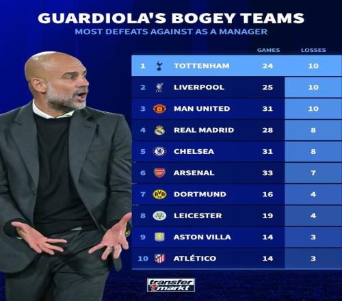 24战10负,热刺是瓜迪奥拉教练生涯至今输球场次最多的对手